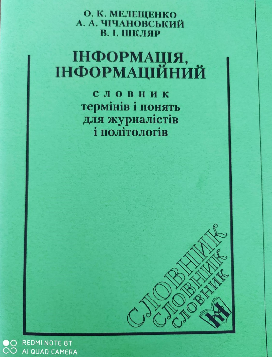 Мелещенко О. К. Інформація, інформаційний : словник термінів і понять для журналістів і політологів / О. К. Мелещенко, А. А. Чічановський, В. І. Шкляр. – Київ : Грамота, 2007. – 72 с. – (Словник)