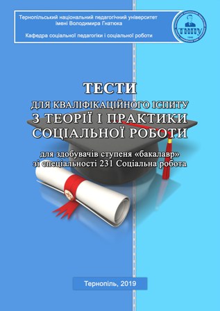 Тести для кваліфікаційного іспиту з теорії і практики соціальної роботи: для здобувачів ступеня «бакалавр» зі спеціальності 231 Соціальна робота / О. Главацька, Н. Горішна, Н. Олексюк, Г. Слозанська; за заг. ред. О. Главацької, В. Поліщук. – Тернопіль : Вектор, 2019. – 130 с. – (4 прим.)