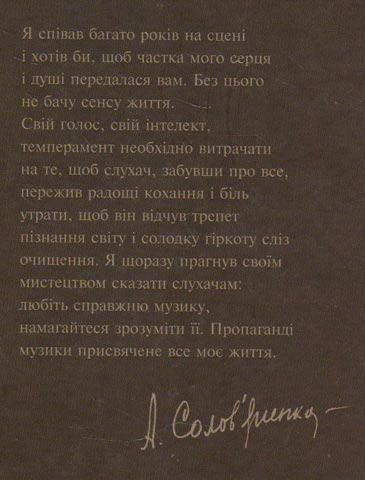 Терещенко, А. К. Анатолій Солов'яненко : творчий шлях / Алла Терещенко ; добір і упоряд. іл. матеріалу С. Солов'яненко. — К. : Либідь, 2009. — 352 с. — (Бібліотека Шевченківського комітету). Анатолій Солов'яненко... Кожен в Україні знає це ім'я, що асоціюється з високою виконавською культурою, образами улюблених опер, з романсами і народними піснями, з прекрасним голосом, який звучав на всіх континентах, у країнах Заходу і Сходу, Америки і в Австралії, на оперних і концертних сценах, на стадіонах і площах. |