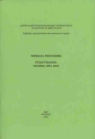 Тимошик М. С. Як редагувати книжкові та газетно-журнальні видання : практичний посібник / М. С. Тимошик. — К.: Наша культура і наука, 2012. — 384 с. (Серія "Бібліотека видавця, редактора, автора" т.4) — ISBN 978-966-7821-55-5 Йдеться про сутність професії редактора, функціональні обов'язки, етичні засади редакторської діяльності. Детально висвітлюється методика, технологія редагування, його види та завдання. Окремо акцентується увага на особливостях редакторської підготовки різних видів видань. Подаються конкретні приклади та рекомендації. |